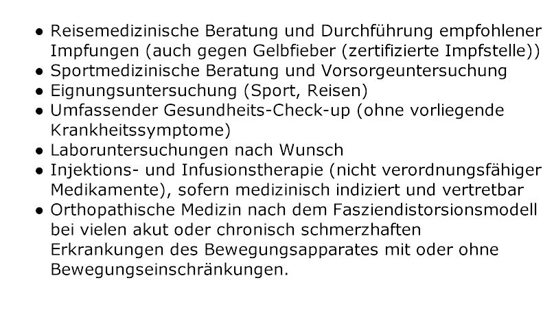 Diese Leistungen gehören nicht zum Leistungskatalog der gesetzlichen Krankenversicherung, so daß Sie von uns eine Rechnung nach der geltenden Gebührenordnung für Ärzte bekommen, die Sie leider selbst zahlen müssen. Bei manchen Leistungen (z.B. Reiseimpfungen) werden jedoch häufig Zuschüsse der gesetzlichen Krankenkasse gewährt, bitte fragen Sie diesbezüglich einen Mitarbeiter Ihrer Versicherung! Sind Sie privat krankenversichert, entnehmen Sie den Leistungsumfang Ihrer Versicherung bitte Ihren Vertragsunterlagen!